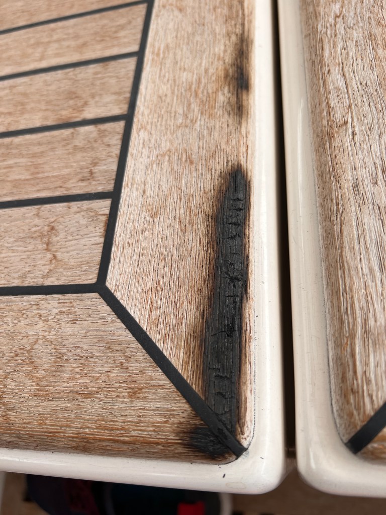 Etter det kraftige regnskyllet hadde det samlet seg regnvann som hang som en stor dråpe inni plastvinduet i Biminien (soltaket vårt). Da kunne det gått riktig galt. Faktisk så galt at vi kunne vært uten vårt lille hjem nå. Regnvannet skapte en stor linse og samler solstrålene i ett fokuspunkt. Fokuspunktet var stolene i cockpit og også teak benken.