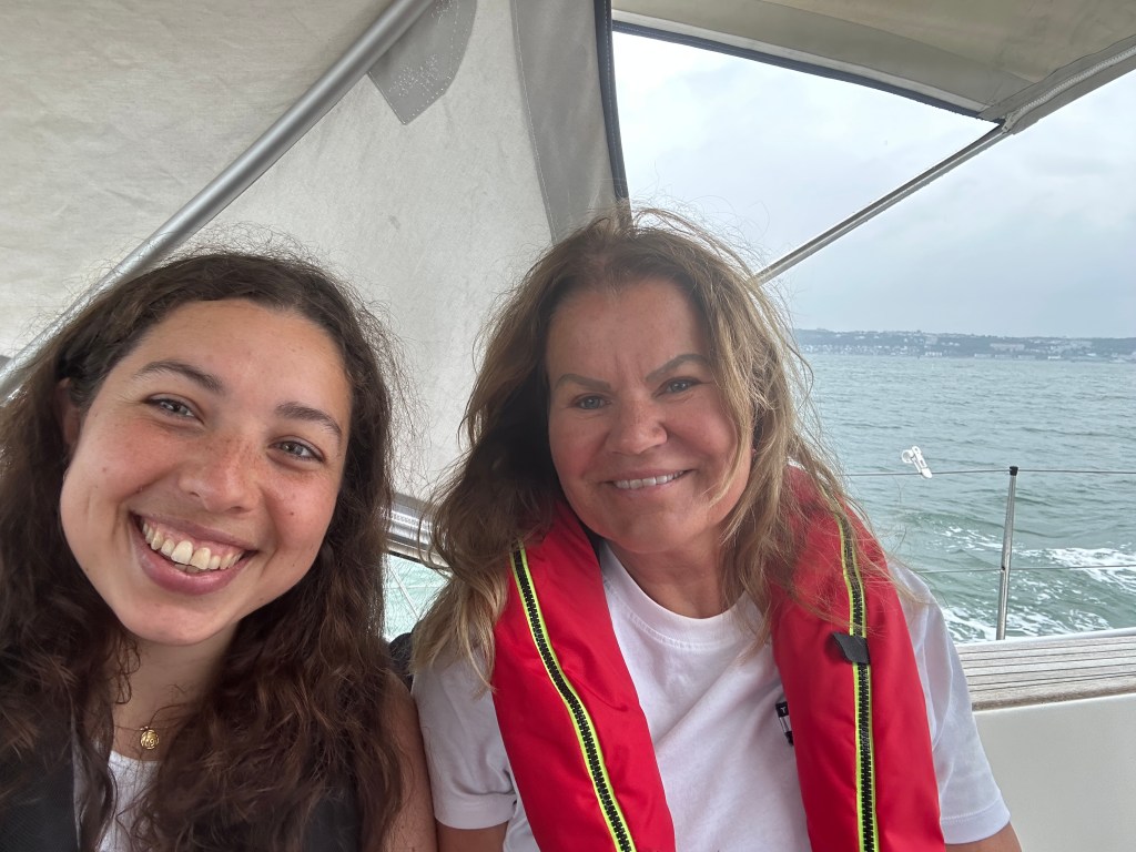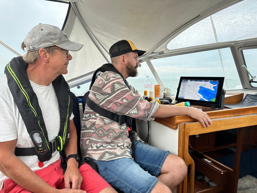 Elise og jeg er matroser på vei til Honfleur dagen etter. Michael og Fred er navigatører. Fortsatt ingen vind. Nesten som vi seiler en motorbåt:)