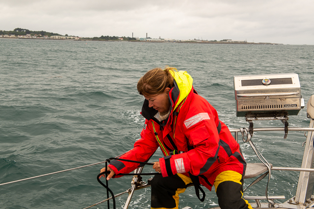 Etter noen flotte dager, satte vi kursen til Roscoff. Været var skiftende og det var faktisk ganske kaldt. De siste nautiske milene småregnet det, og vi fikk vind opp mot 25 knop rett i mot. Så da var det fram med seiltøy.