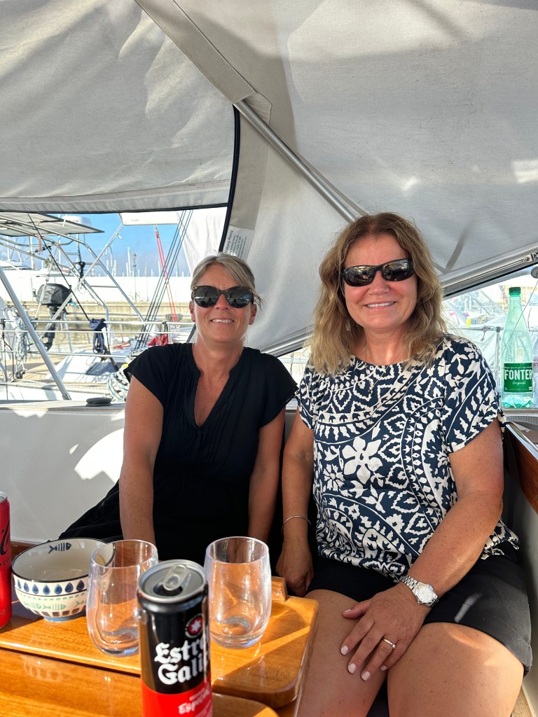 Endelig framme i Cascais og trygt i marina kunne vi slappe av. Vi ble invitert på ankerdram i Bonita, og det ble raskt en kjempehyggelig kveld. Bodil serverte oss etterhvert middag mens det regnet bøtter og spann der ute. Snart var alle tanker om dårlig vær som blåst bort.